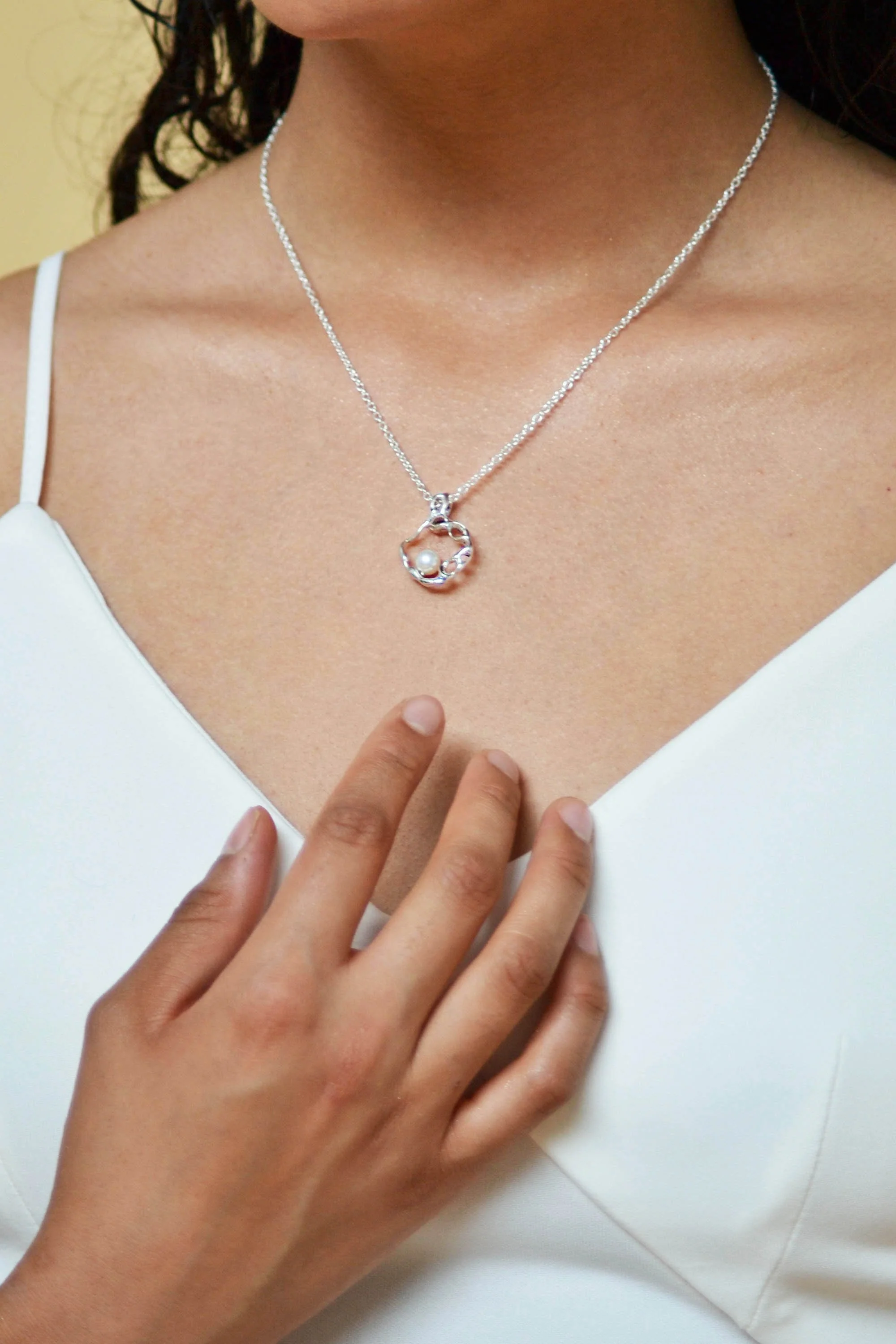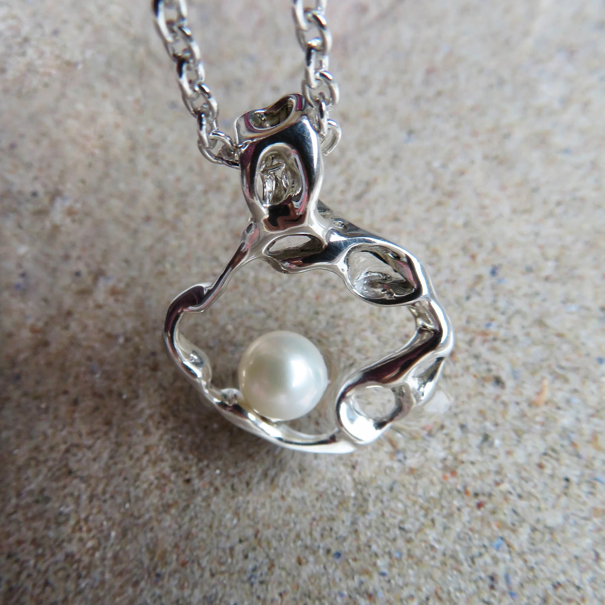 Exquisite handmade silver pendant with the effect of a floating pearl. It has a glossy, water-like polish and features one white high-quality freshwater cultured pearl. Inspired by the undeniable beauty of the seascape.
